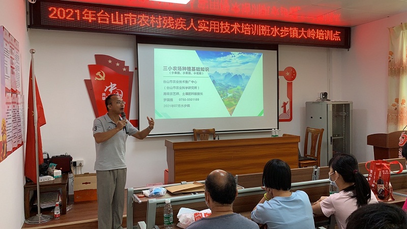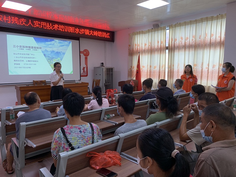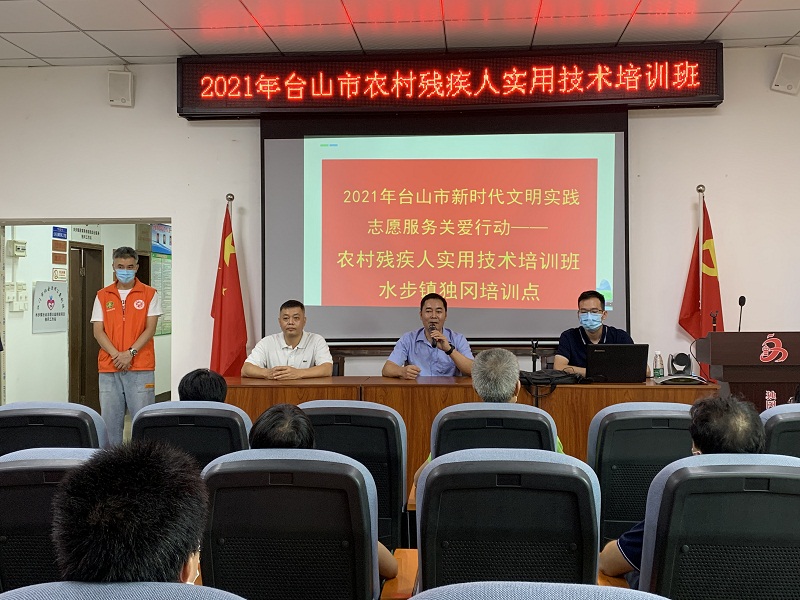 受疫情、台风等影响,两度延期的台山市残疾人实用技术培训于7月22日上午在水步镇独冈、大岭两个村委会率先开班。首批参训的近50名残疾学员及党员志愿者早早集中在培训点进行扫码测温、签到登记,市残联、人社及水步镇政府领导到场致辞,台山电视台现场专题采访报道。