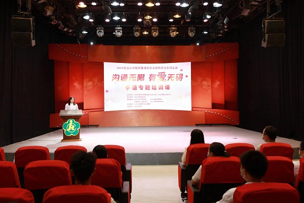 8月1日,为推进我市信息无障碍建设,进一步营造无障碍和谐交流的人文环境,市残联联合市委文明办、市科工商务局、市政数局、团市委、市特殊教育学校在市融媒体演播厅举办 “沟通无限 有爱无碍”手语培训。市行政服务中心窗口服务人员、志愿者骨干共40多人参加了培训。