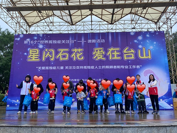 在第16个“世界孤独症日”到来之际,4月1日市残联联合市红十字在台山石花广场举办“星闪石花,爱在台山”为主题的微跑活动,台山市特殊儿童康复教育中心40多对亲子,社会各界50名志愿者参与活动。