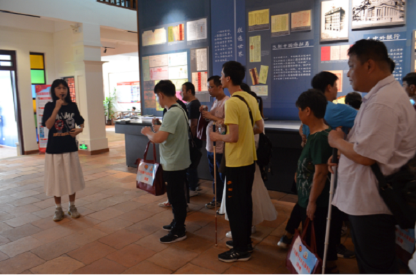 为丰富和活跃盲人朋友的精神文化生活,引导盲人朋友感党恩、听党话、跟党走,下午邀请盲人朋友走进端芬镇海口埠银信博物馆开展“追寻红色足迹,涉取奋进力量”志愿服务活动。盲人朋友在博物馆讲解员的陪同下,静静地聆听台山华侨出国拼搏的历史及特定历史条件出现的银信文化,与文物近距离“接触”,感受华侨爱国爱乡的深厚情感。盲人朋友们纷纷表示,“眼睛看不到,但是能感受到,一百多年来华侨移民海外的艰难历程和拼搏精神,以及爱国爱乡的深厚情怀和乐于奉献的高尚情操”。